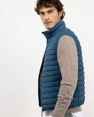 Chaleco de hombre acolchado confeccionado en nylon reciclado, repelente al agua. Su diseño Slim Fit proporciona un ajuste moderno y estilizado. Cuenta con cremallera central acompañada de un detalle de bandera de 3 mm en el interior, sisa elástica para mayor comodidad. Dispone de bolsillos frontales con cremallera y un bolsillo interior adicional. El logo, con acabado engomado, ubicado en el pecho.