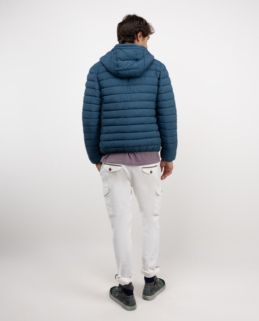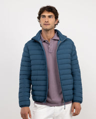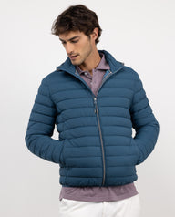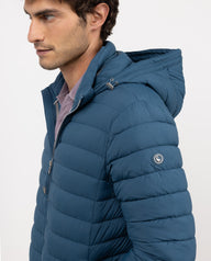 Chaqueta de hombre acolchada lisa confeccionada en tejido de nylon reciclado repelente al agua. Tiene un corte Slim Fit, cuello con capucha desmontable y cierre con cremallera con un detalle de bandera de 3mm en el interior. Manga larga, bolsillos laterales con cremallera y bolsillos interiores. | REPREVE. En nuestro camino hacia ser una marca 100% sostenible hemos querido usar para el tejido interior, una fibra de alto rendimiento y de última generación, fabricada con todo tipo de materiales reciclados, incluidas las botellas de plástico. Hasta ahora, la empresa ha conseguido reciclar más de 31.000 millones de botellas de plástico y el contador sigue subiendo cada segundo.