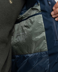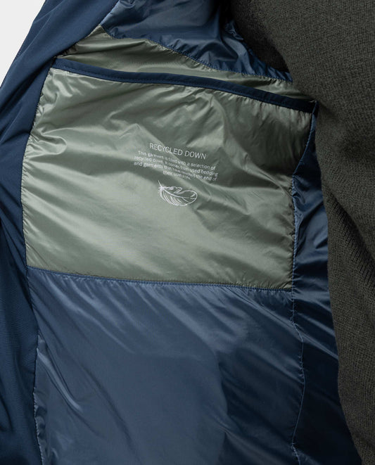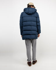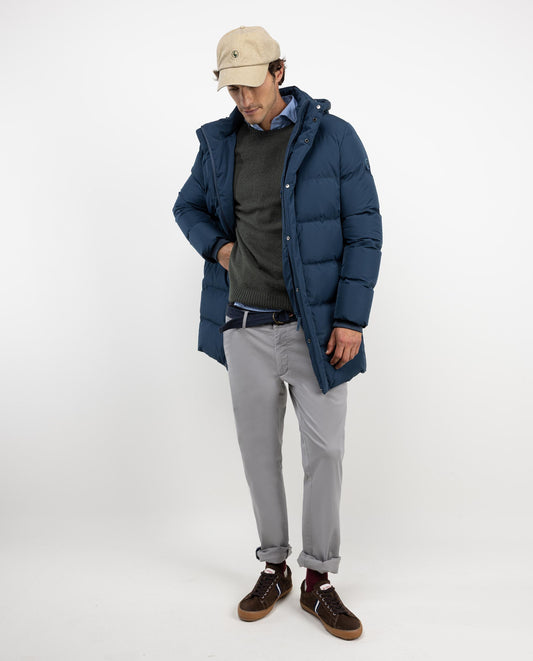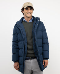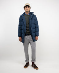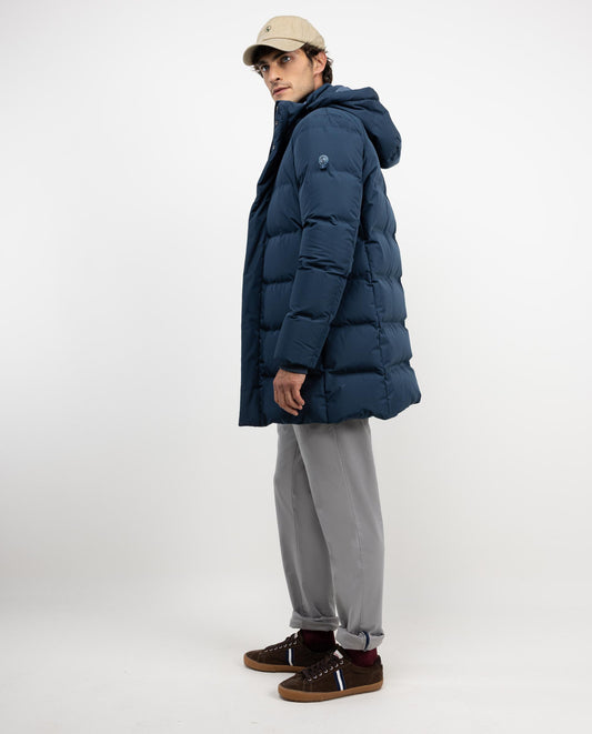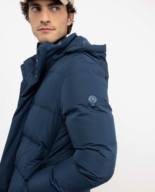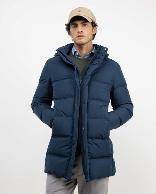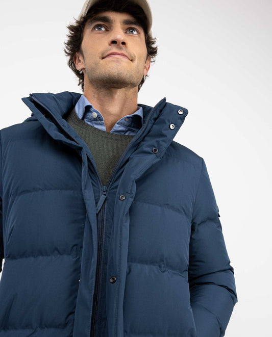 Abrigo largo acolchado de hombre. Relleno interior de pluma reciclada. Tejido de poliéster repelente al agua. Corte Regular Fit. Cuello con capucha desmontable con cremallera. Cierre con cremallera y tapeta con snaps. Detalle de cinta de bandera en la tapeta interior.