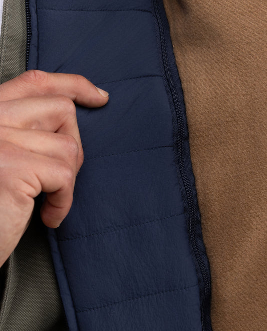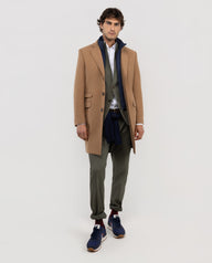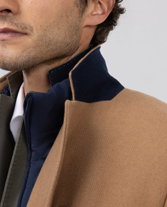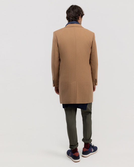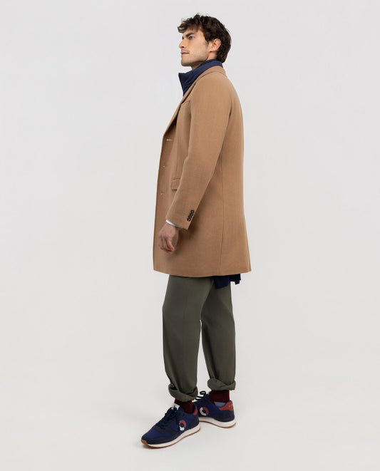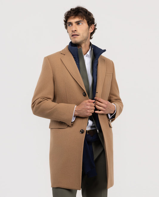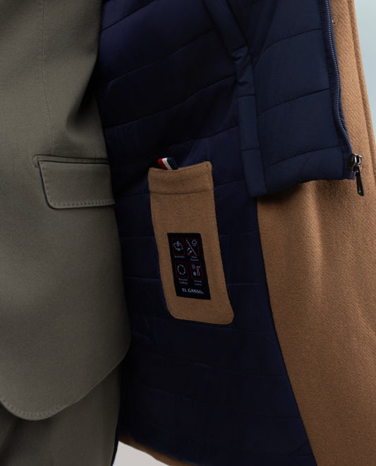 Nuestro abrigo de hombre más emblemático, de paño liso y confeccionado en lana con un acabado repelente al agua. Cuello con solapa de muesca y ojal, cierre mediante tres botones. Un bolsillo insertado a la altura del pecho, tres bolsillos de cartera a la altura de cadera y bolsillos interiores. Tiene puño de cuatro botones y una abertura en la parte posterior. Lleva vista interior con acolchado sostenible y extraible. Forro interior guateado con franjas a contraste. En el bajo cuello lleva tejido corbatero como detalle. Dato interesante: el tejido de este abrigo es transpirable, repelente al agua y la temperatura se mantiene ante cualquier estado del ambiente además de aislar del frío. El relleno acolchado que lleva el abrigo es de Sorona®, un relleno térmico especial fabricado por Dupont que además de retener el calor corporal, es aislante, transpirable y reciclado.
