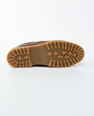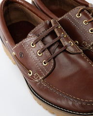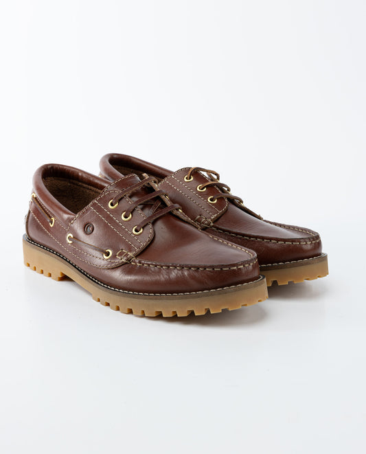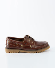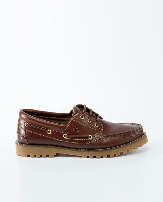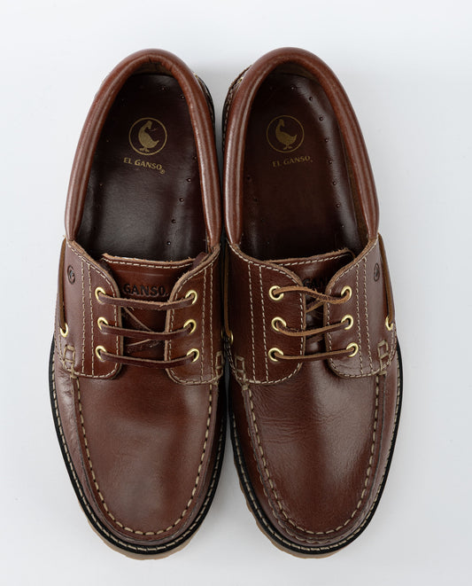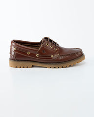 Náutico de hombre marrón confeccionado en 100% piel. Lleva cordones de cuero, ojetes metálicos, pespuntes a contraste y suela de goma personalizada. Logo grabado al tono en antifaz.