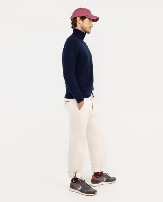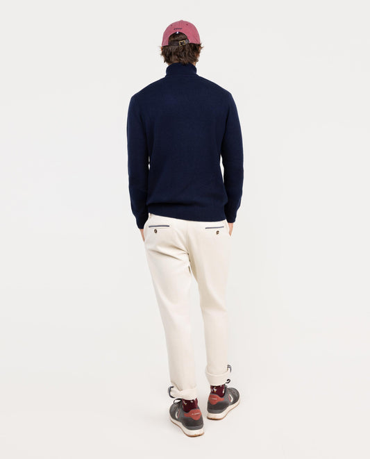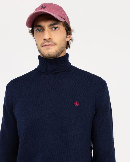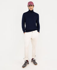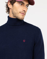 Jersey de hombre con cuello vuelto confeccionado con lana merino. Manga larga y contraste de franja ancha en bajo y puños. Corte Slim fit.