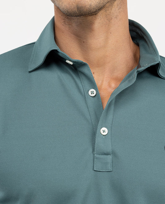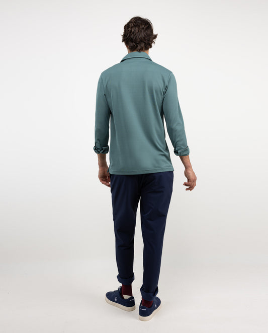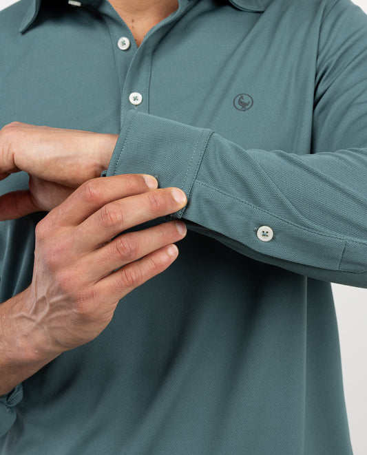 Polo de hombre liso con tecnología Sepiia de manga larga confeccionado en tejido 100% poliéster técnico antibacteriano reciclable. Corte slim fit, cuello clásico, cierre mediante tapeta de dos botones. Logo bordado a contraste a la altura del pecho. Estos tejidos han sido producidos en España y las prendas han sido confeccionadas en Portugal de una forma sostenible.
