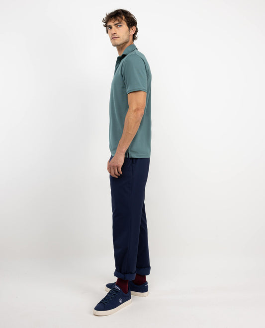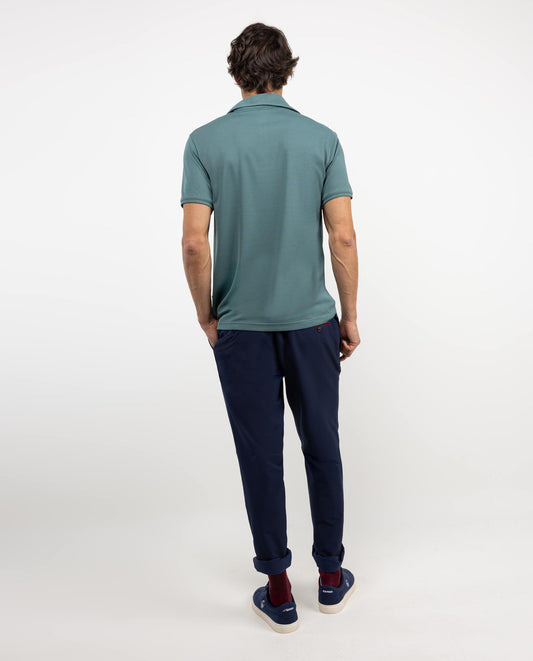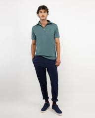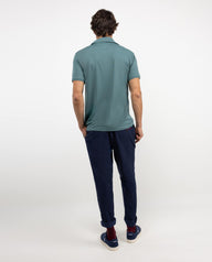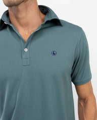 Polo de hombre liso con tecnología Sepiia de manga corta confeccionado en tejido 100% poliéster técnico antibacteriano reciclable. Corte slim fit, cuello clásico, cierre mediante tapeta de dos botones. Logo bordado a contraste a la altura del pecho. Estos tejidos han sido producidos en España y las prendas han sido confeccionadas en Portugal de una forma sostenible.