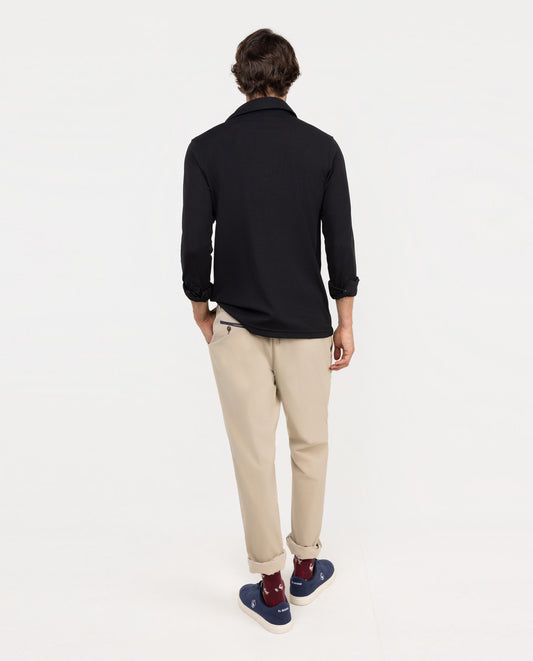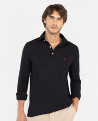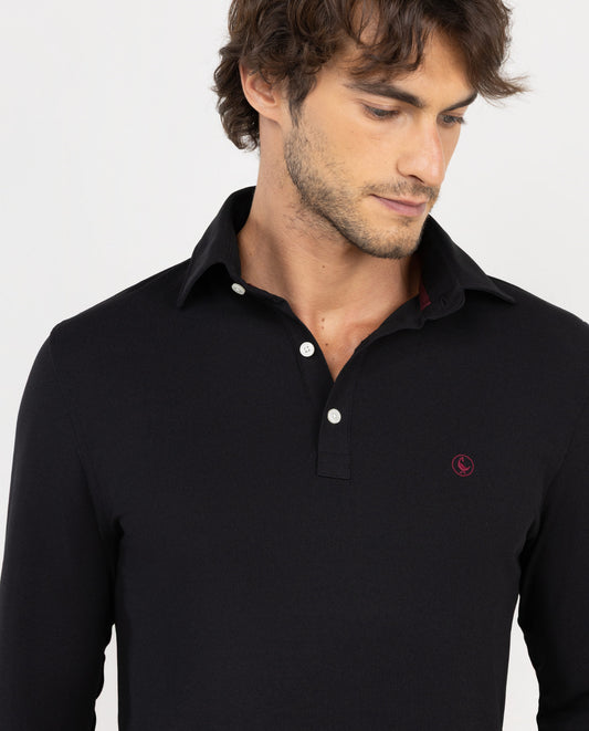 Polo de hombre liso con tecnología Sepiia de manga larga confeccionado en tejido 100% poliéster técnico antibacteriano reciclable. Corte slim fit, cuello clásico, cierre mediante tapeta de dos botones. Logo bordado a contraste a la altura del pecho. Estos tejidos han sido producidos en España y las prendas han sido confeccionadas en Portugal de una forma sostenible.