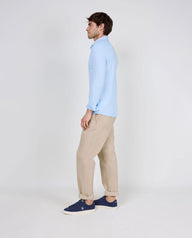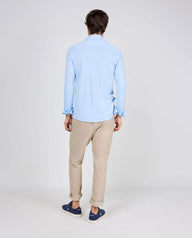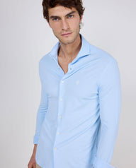 Camisa de hombre lisa con tecnología Sepiia confeccionada en 100% poliéster técnico antibacteriano reciclable. Corte Slim Fit, cuello italiano y cierre con botones. Manga larga terminada en puño simple y logo bordado en el pecho a tono. Tiene cortes en la espalda que permite ajustarse ligeramente al cuerpo, manteniendo la comodidad. Costura del hombro reforzada, para prevenir el desgaste por el uso. Bajo redondeado. Estos tejidos han sido producidos en España y las prendas han sido confeccionadas en Portugal de una forma sostenible.