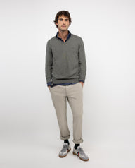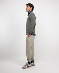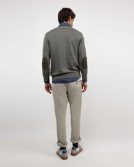 Jersey liso de hombre, fabricado en mezcla de algodón y cashmere para conseguir una calidad con mayor suavidad. Corte Regular Fit, cuello de pico y manga larga. Logo bordado en el pecho y coderas de antelina a tono.