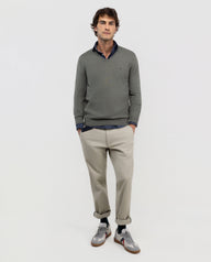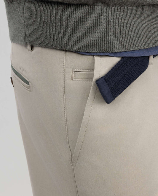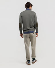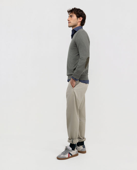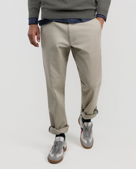 Pantalón chino de hombre confeccionado en tejido gabardina con 77% algodón, 20% de algodón reciclado y 3% elastano. Lleva un lavado final con enzima ácida lo que le da un aspecto desgastado. Corte Regular Fit, cierre mediante cremallera oculta por tapeta y botón. Tiene bolsillos delanteros y en los traseros lleva vivo a contraste. Incluye cinturón de canvas.