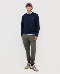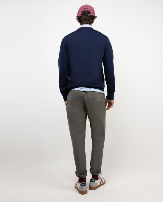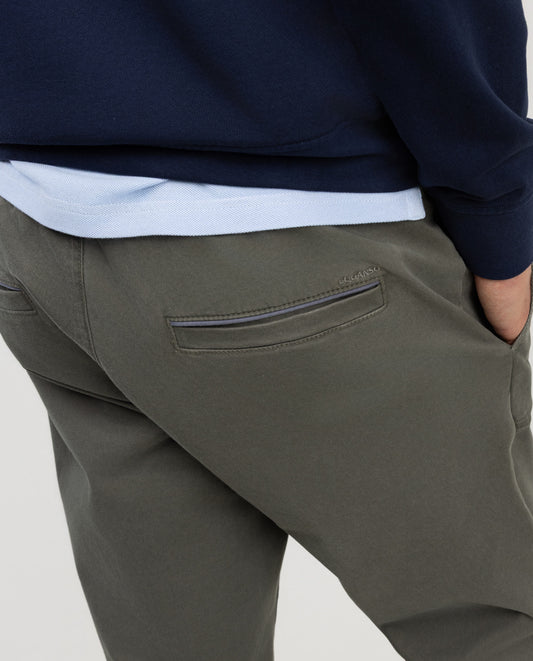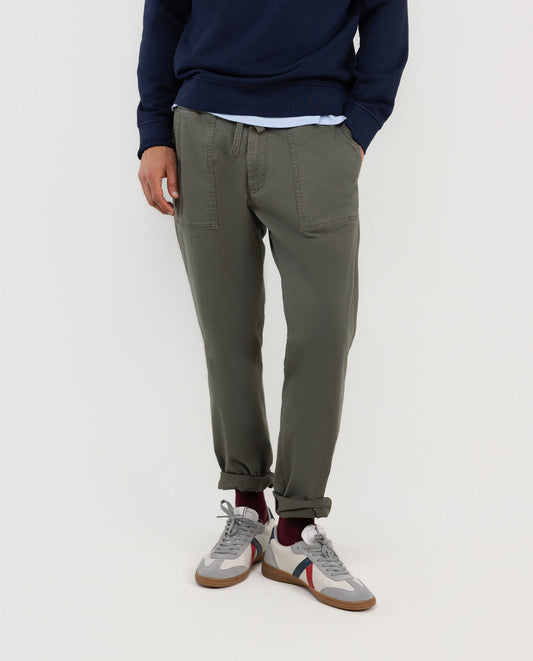 Pantalón de hombre con bolsillos tipo carpintero y gomas elásticas en la cintura. Cuenta con un lavado vintage que le proporciona una imagen desgastada.