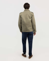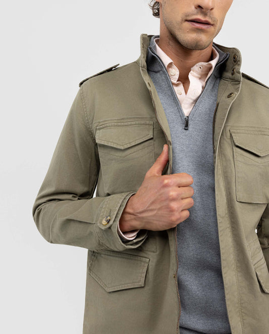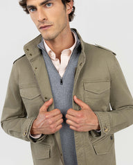 Chaqueta de hombre confeccionada en algodón con elastán para una mayor comodidad. Corte Regular Fit, cuello alto, múltiples bolsillos tipo cargo con tapeta y cierre mediante cremallera oculta por tapeta con botones tipo snap. Manga larga terminada en puño con tira abotonada y cintura ajustable mediante cordón.