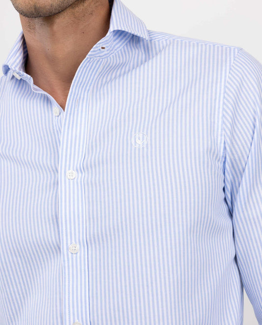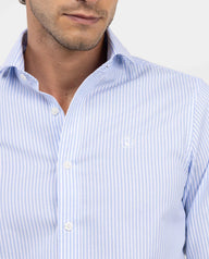 Camisa de hombre lisa confeccionada en tejido 100% algodón. Corte slim fit, cuello spread con ballenas y cierre con botones. Manga larga terminada en puño con dos botones y logo en el pecho.