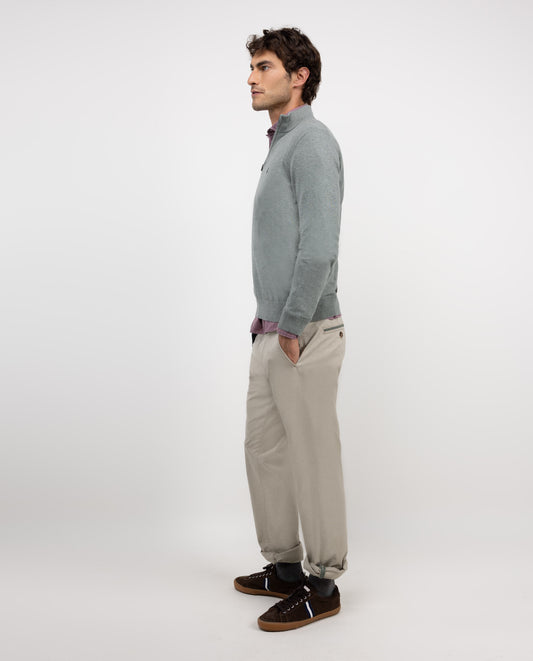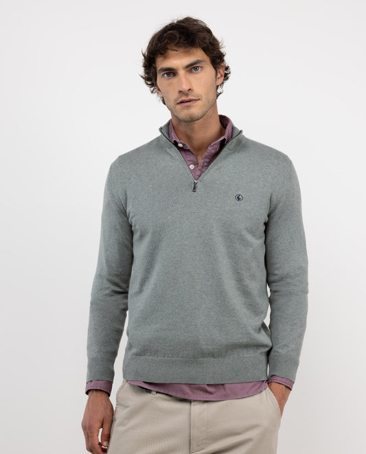 Jersey liso de hombre cuello mock fabricado en mezcla de algodón y cashmere para conseguir una calidad con mayor suavidad. Corte regular fit, cuello mock y cierre mediante cremallera. Manga larga acabada en rib y detalle en la cremallera. Logo bordado en el pecho.