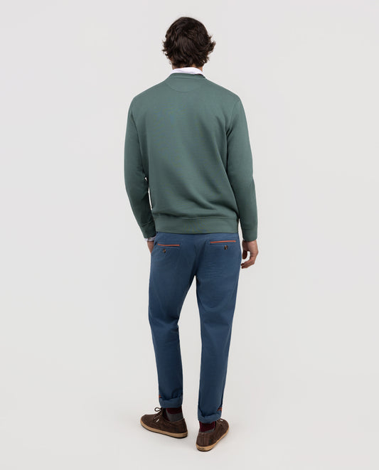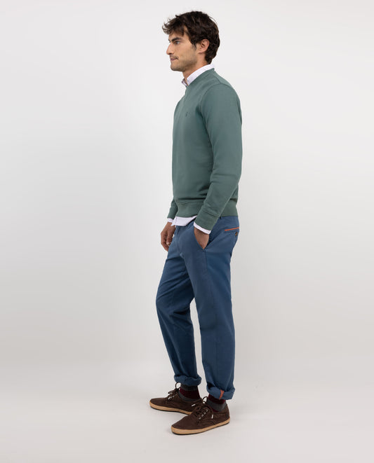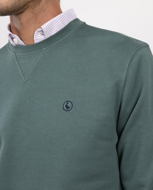 Sudadera lisa de hombre confeccionada en felpa 100% algodón, tintada en prenda envejecida para darle un acabado lavado. Tiene un corte Regular Fit, cuello redondo y manga larga. Lleva logo bordado en el pecho.