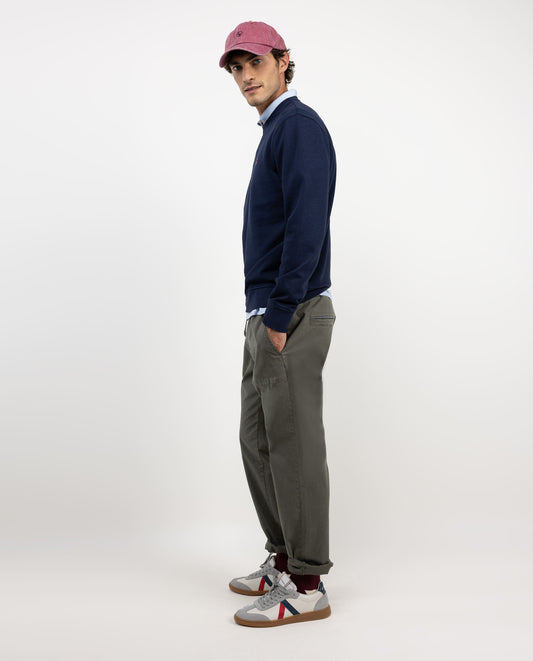 Sudadera lisa de hombre confeccionada en felpa 100% algodón, tintada en prenda envejecida para darle un acabado lavado. Tiene un corte Regular Fit, cuello redondo y manga larga. Lleva logo bordado en el pecho.