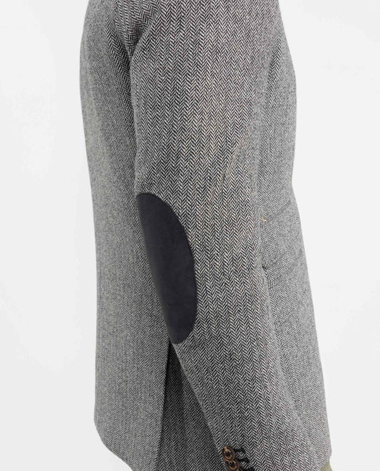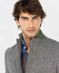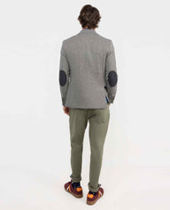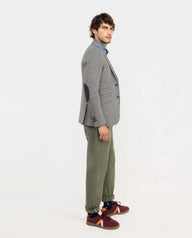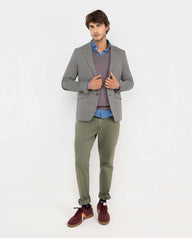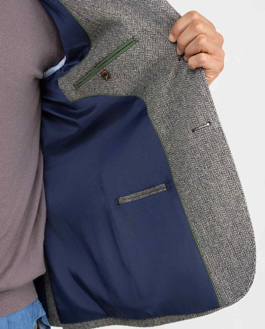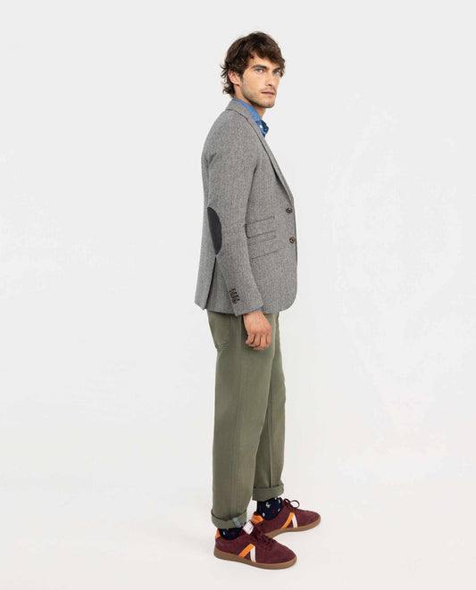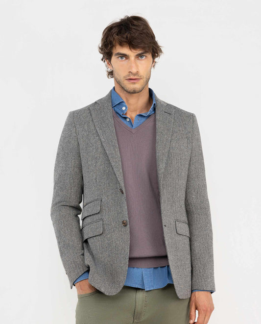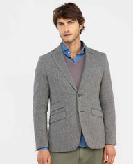 Americana de hombre confeccionada en lana de espiga con acabado repelente al agua. Tiene un corte slim fit con solapa de pico, cierre con dos botones. Bolsillos frontales de vivo en pecho y de solapa en cadera.