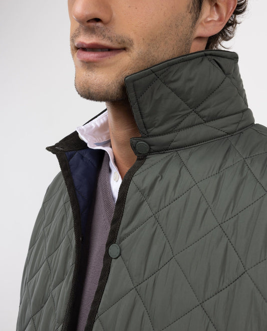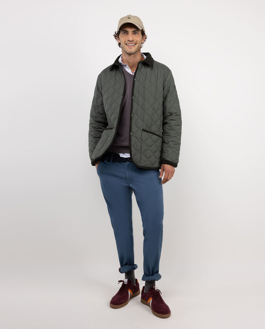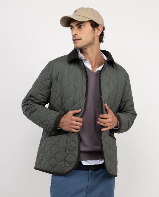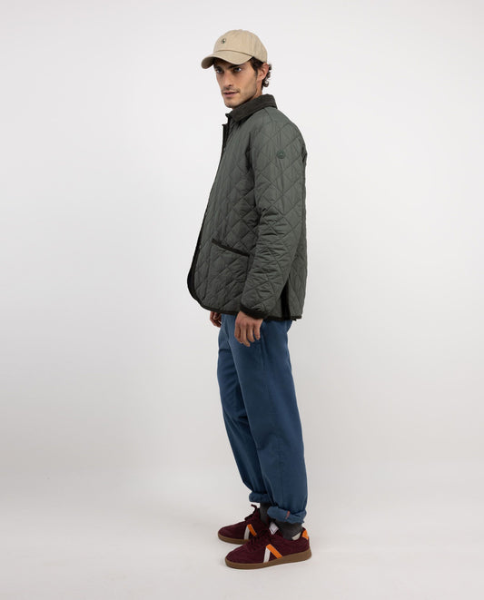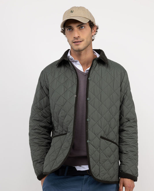 Chaqueta de hombre acolchada guateada, ligera y con cuello de pana. Relleno interior de Repreve. Corte Regular fit para un uso más cómodo. Botones a presión. Bolsillos parche y logo en manga. Resistente al agua y al viento.