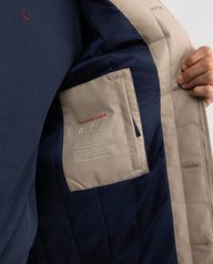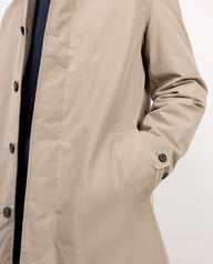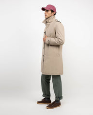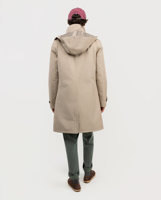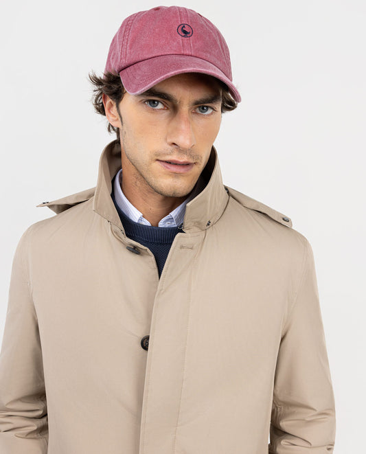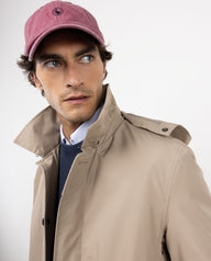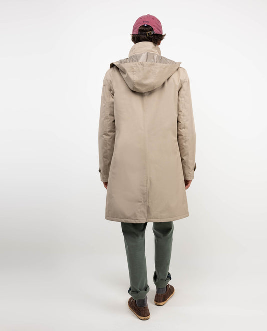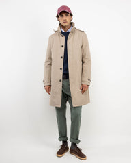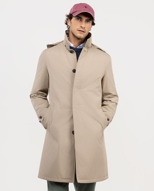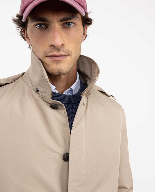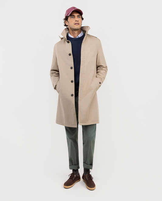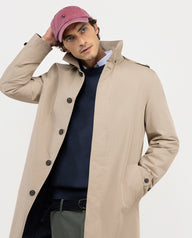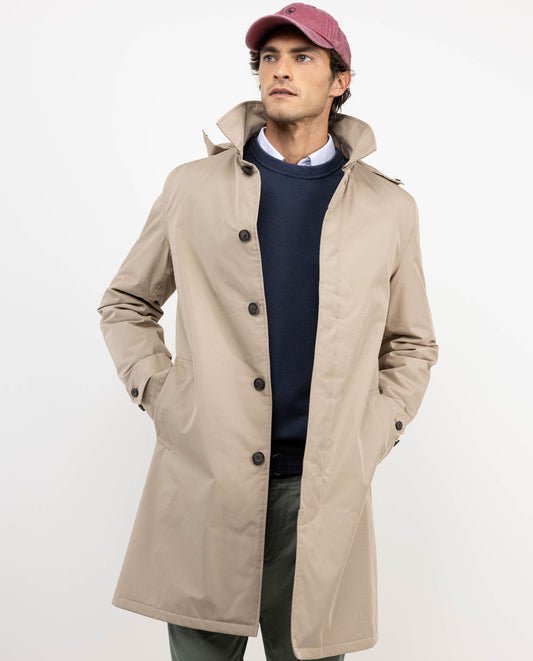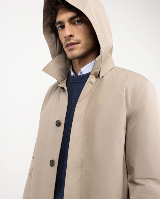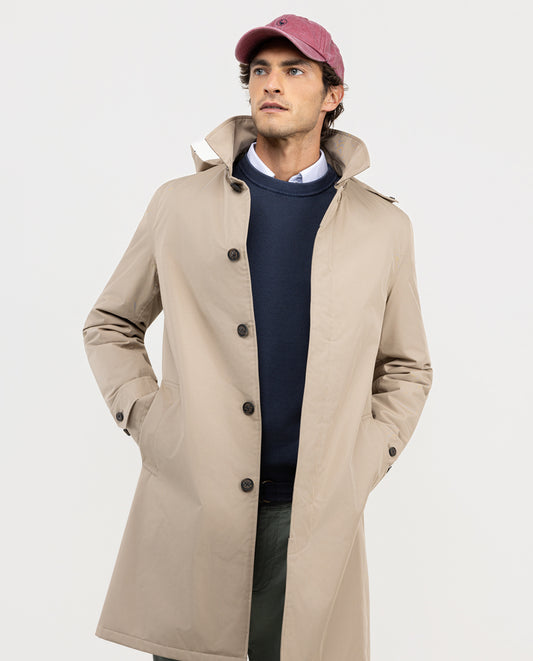 Gabardina de hombre confeccionado en algodón y poliéster reciclado. Tejido repelente al agua. Corte Regular Fit, cuello clásico, capucha desmontable y cierre con botones. Manga larga y dos bolsillos laterales en exterior y uno en el interior. Abertura trasera en el bajo.