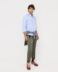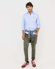 Camisa lisa de hombre confeccionada en 100% algodón con acabado peach. Corte Slim Fit, cuello spread y cierre con botones. Manga larga terminada en puño simple y logo en el pecho bordado.