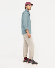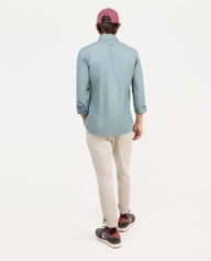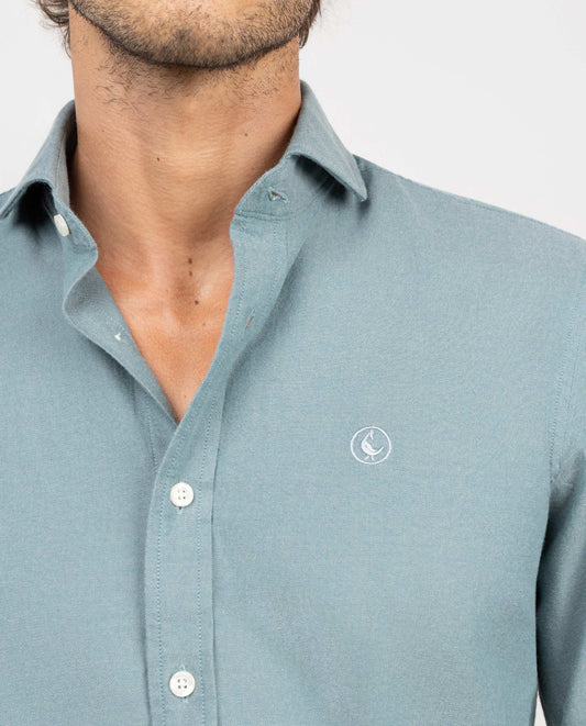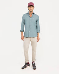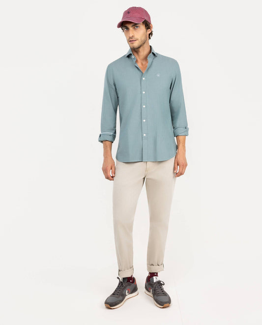 Camisa lisa de hombre confeccionada en 100% algodón con acabado peach. Corte Slim Fit, cuello spread y cierre con botones. Manga larga terminada en puño simple y logo en el pecho bordado.