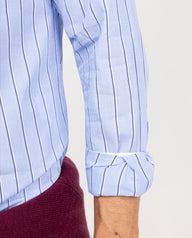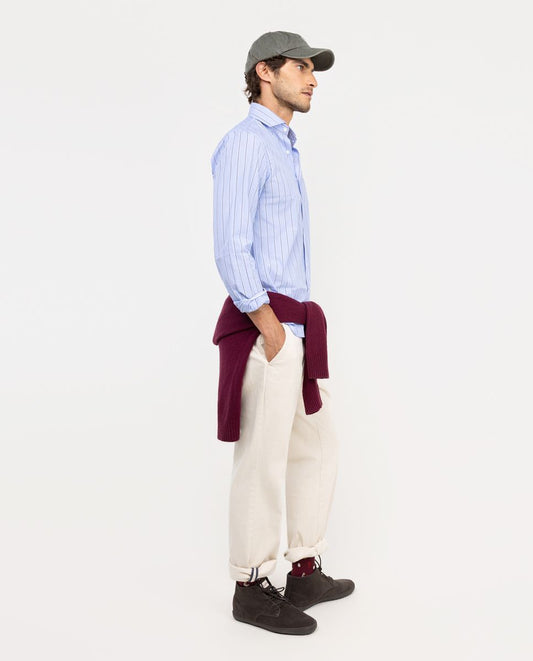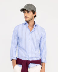 Camisa popelín de rayas de hombre confeccionada en 100% algodón. Corte Slim Fit, cuello italiano con ballenas. Manga larga terminada en puño simple y logo en el pecho bordado.