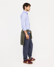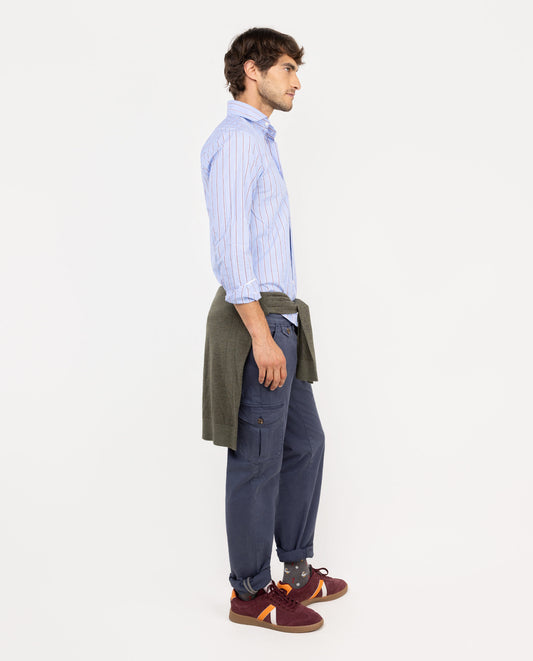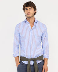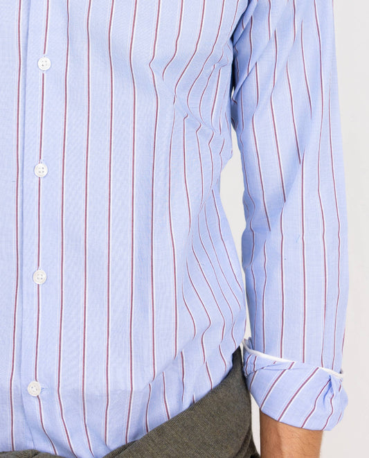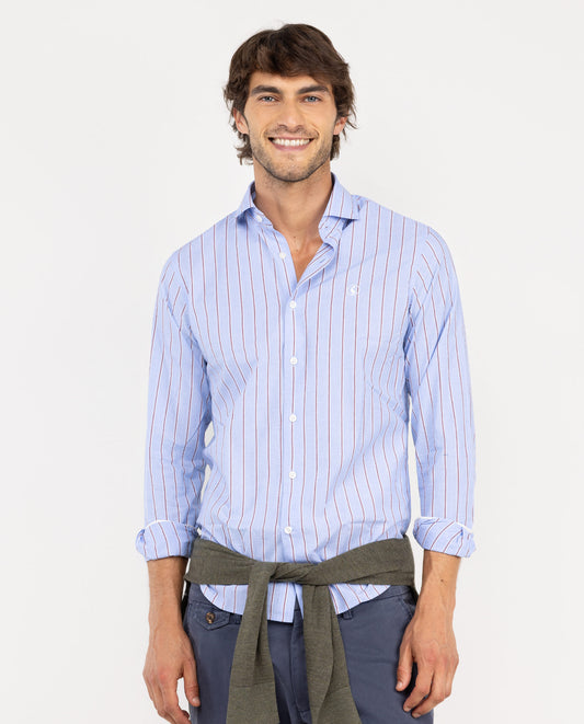 Camisa popelín de rayas de hombre confeccionada en 100% algodón. Corte Slim Fit, cuello italiano con ballenas. Manga larga terminada en puño simple y logo en el pecho bordado.