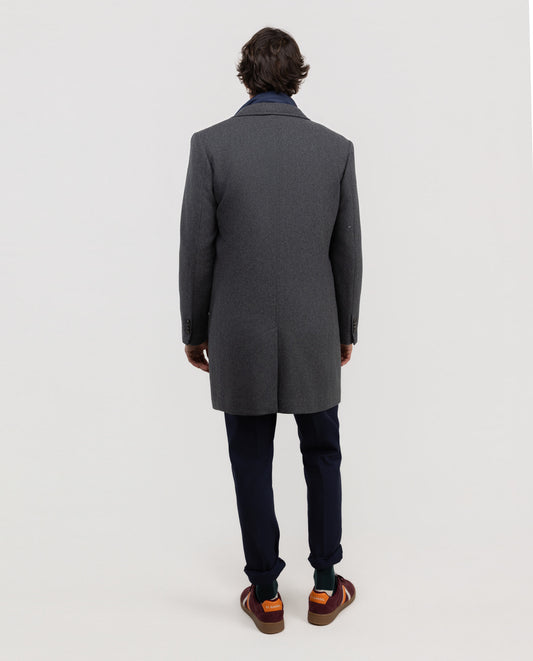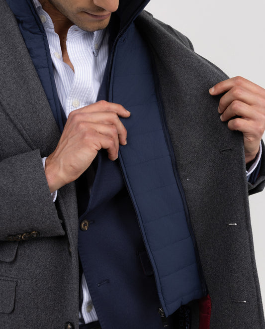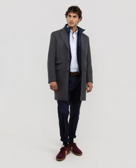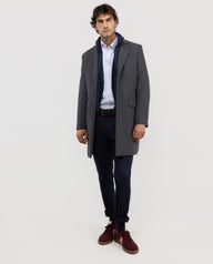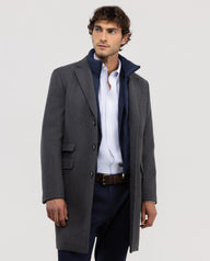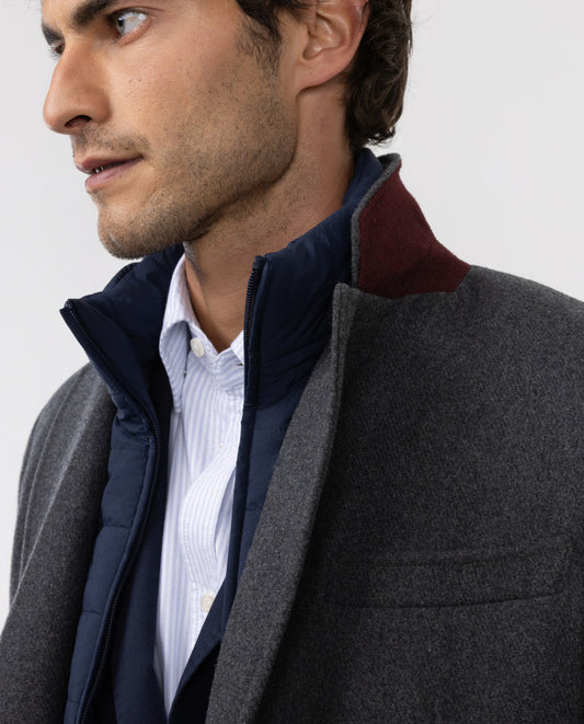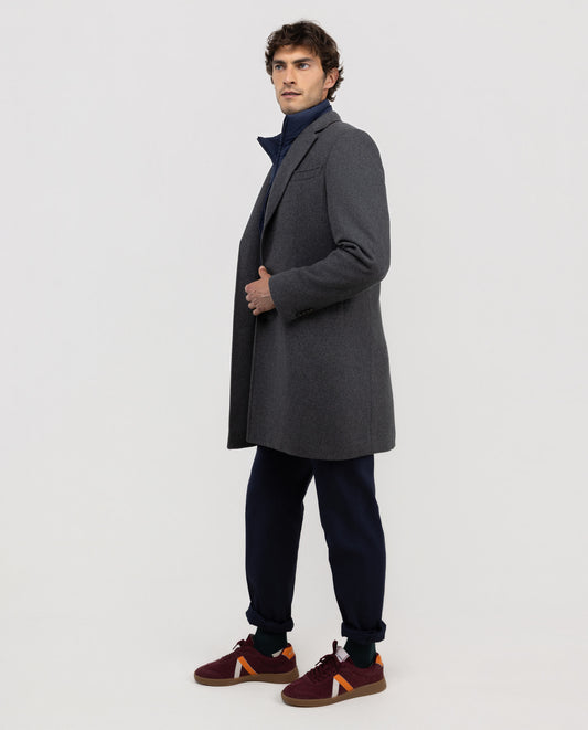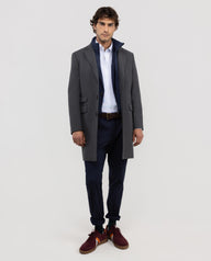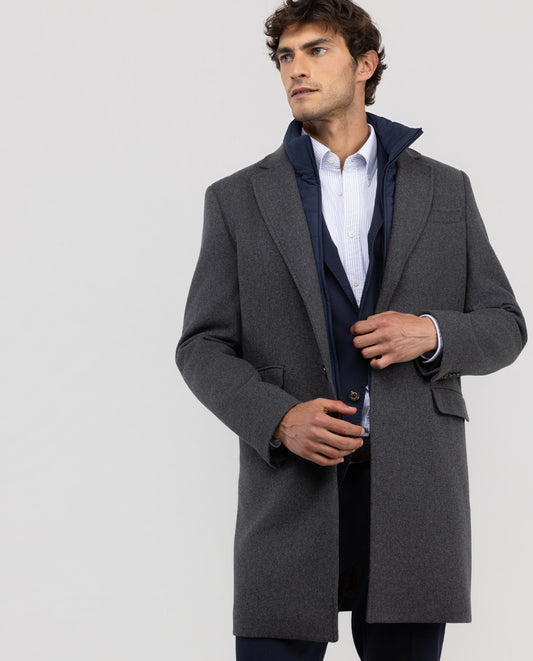 Nuestro abrigo de hombre más emblemático, de paño liso y confeccionado en lana con un acabado repelente al agua. Cuello con solapa de muesca y ojal, cierre mediante tres botones. Un bolsillo insertado a la altura del pecho, tres bolsillos de cartera a la altura de cadera y bolsillos interiores. Tiene puño de cuatro botones y una abertura en la parte posterior. Lleva vista interior con acolchado sostenible y extraible. Forro interior guateado con franjas a contraste. En el bajo cuello lleva tejido corbatero como detalle. Dato interesante: el tejido de este abrigo es transpirable, repelente al agua y la temperatura se mantiene ante cualquier estado del ambiente además de aislar del frío. El relleno acolchado que lleva el abrigo es de Sorona®, un relleno térmico especial fabricado por Dupont que además de retener el calor corporal, es aislante, transpirable y reciclado.